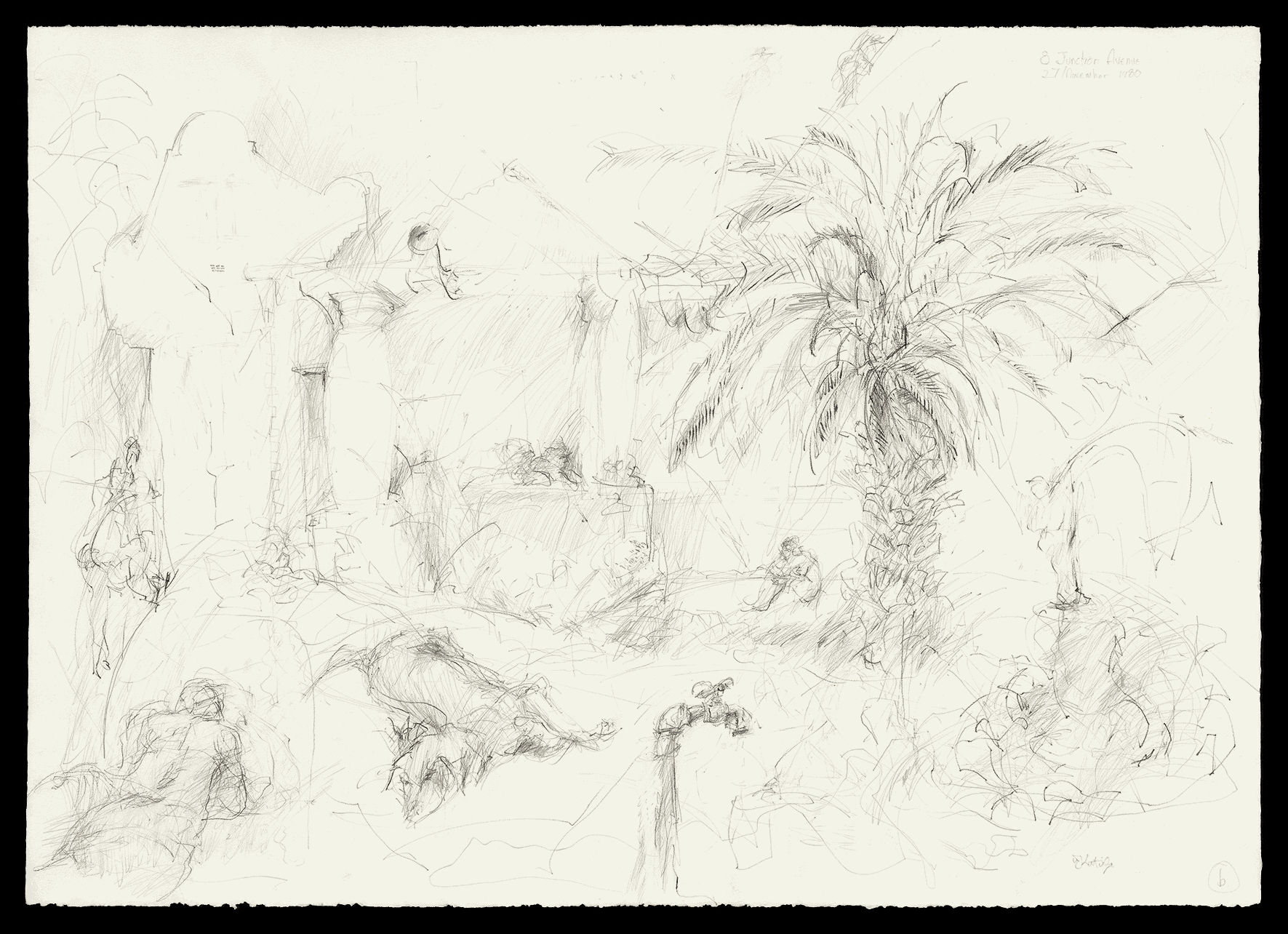 Lunch in the Garden, signed and dated 27 November 1980, also connects with the European tradition recalling in both title and feel the ‘Dejeuner sur l’Herbe’ of Giorgione and Manet, and the ‘Fetes Champetres’ of Watteau and others. The drawing is inscribed ‘8 Junction Avenue’ which Kentridge, in a personal communication, confirmed was the address of a student commune where he stayed with his wife Anne Stanwix - and the rest of the Theatre Company - for a time before leaving for Paris. The commune comprised a series of cottages around a shared garden. Bill Ainslie is reported to have encouraged his students at the Johannesburg Art Foundation to draw in their gardens.