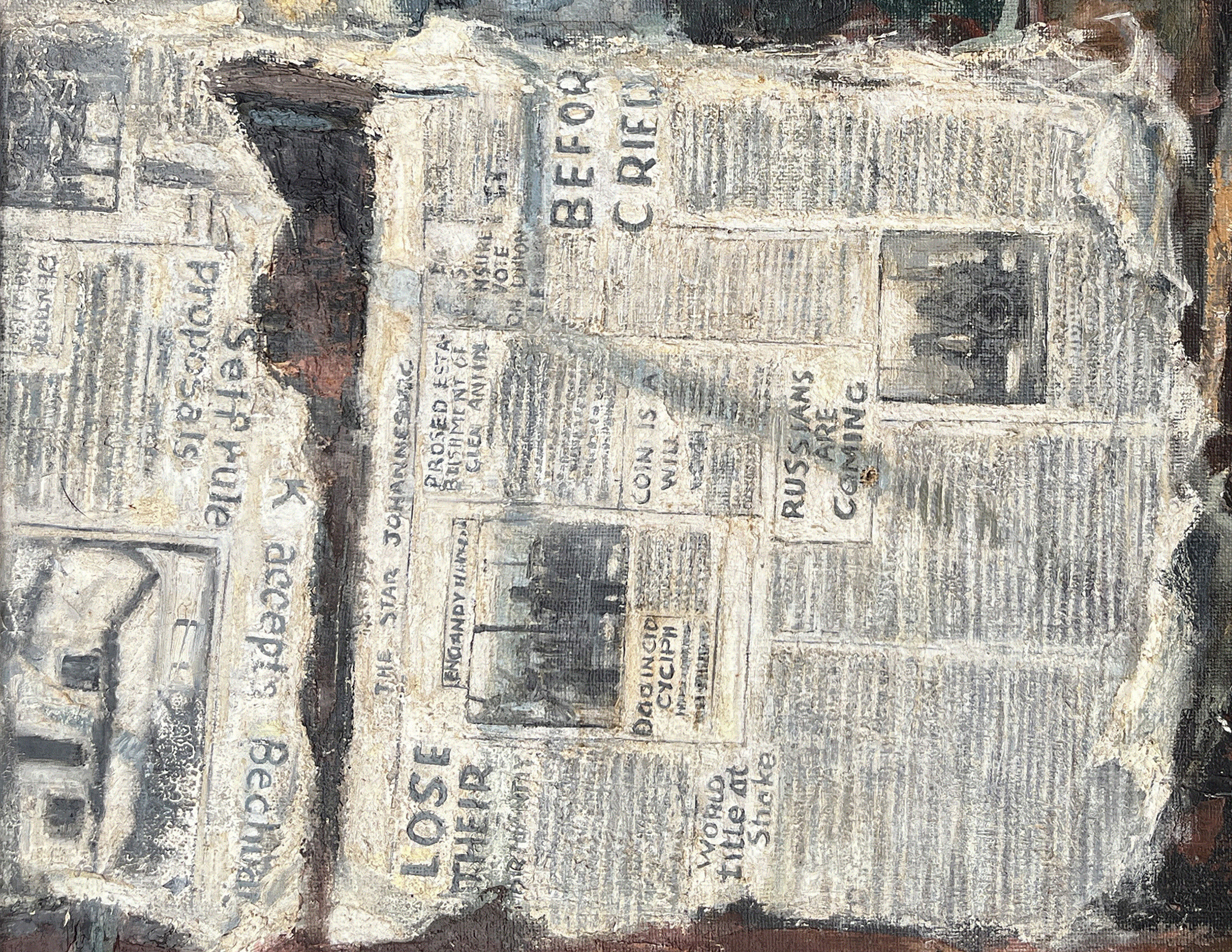 Cautious not to make his comments too legible or literal, he takes care to obscure the more politically oriented headlines. More legible lines include RUSSIANS ARE COMING. A clear reference to the tensions of the Cold War, but more subtly to the opportunism of the incumbent Nationalist regime in South Africa in using this tension to justify and legitimate their own agenda of suppression by referring to any enemies of their policy as Communists, and creating laws for the eradication and punishment thereof, to protect their unjustifiable and increasingly precarious position.